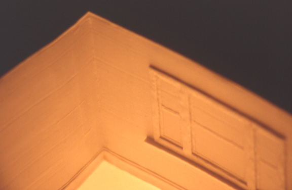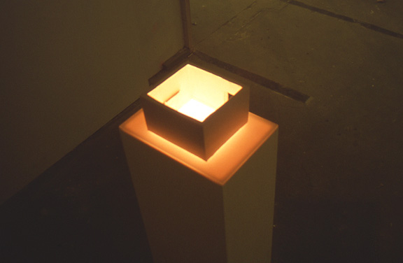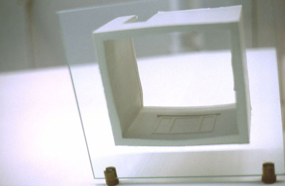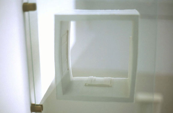 17cm x 19cm x 12cm silicone rubber cast 'room', 23cm x 33cm x 118cm plinth, perspex top, light within.